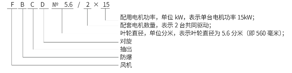 通风型号及含义如下:矿用防爆型抽出式对旋轴流局部通风机