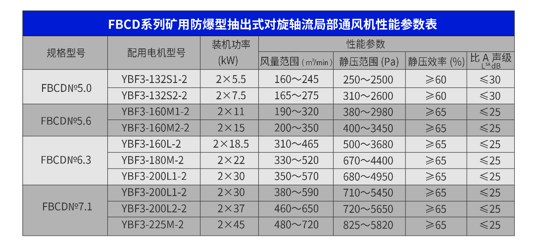 FBCD系列矿用防爆型抽出式对旋轴流局部通风机,适用于煤矿矿井掘进时有瓦斯涌出地点或煤仓等特殊地点,与负压风筒配套使用,做抽出式通风。对高万斯矿井以及含爆炸性气体的场所使用,有着安适可靠的保证。该抽出式通风机由集流器、一级机壳级机壳电动机、叶轮、消音器、连接风筒及防摩擦铜环组成。外壳由优质碳素钢焊接而成,内筒由孔板焊接而成,内装有消音材料。电动机安装在密闭隔爆腔内,冷却有专门设计的进气及排热通道管,与风道内含瓦斯污浊空气隔离,使电机始终运行在新鲜风流中。