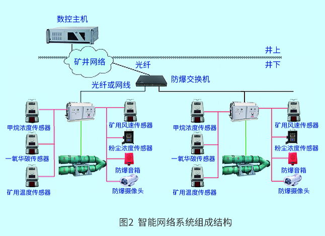 防爆交换机放在井下配电点并接入井下环网交换机,既保证了电源不间断又保证了主网络畅通,防爆交换机到智能变频可选择网线或光纤,距离近选择网线连接(100米以内),距离远选择光纤,智能变频内部预留以太网接口和光纤接口,视频和传感器数据等通过以太网上传到调度室上位机。
