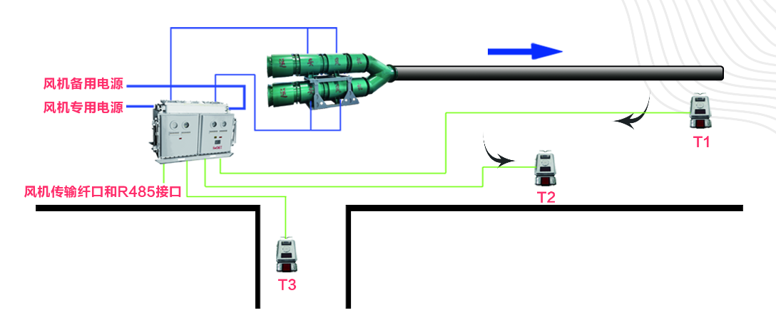 风量、CO、粉尘、温度信号位置及数量根据实际井下工况合理布置。