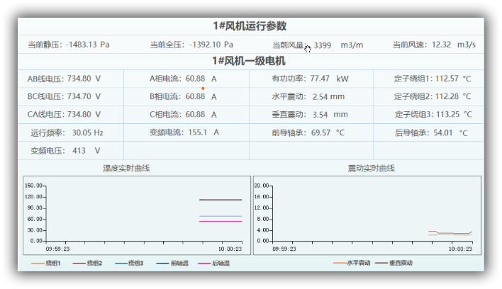 (2) 隧道风机运行实时监测(电机绕组温度及轴承温度;电机电流、电压、功率等参数;通风机的运行状态、风量、风速、通风机效率等相关参数);