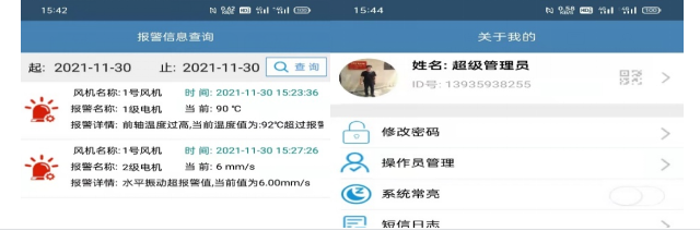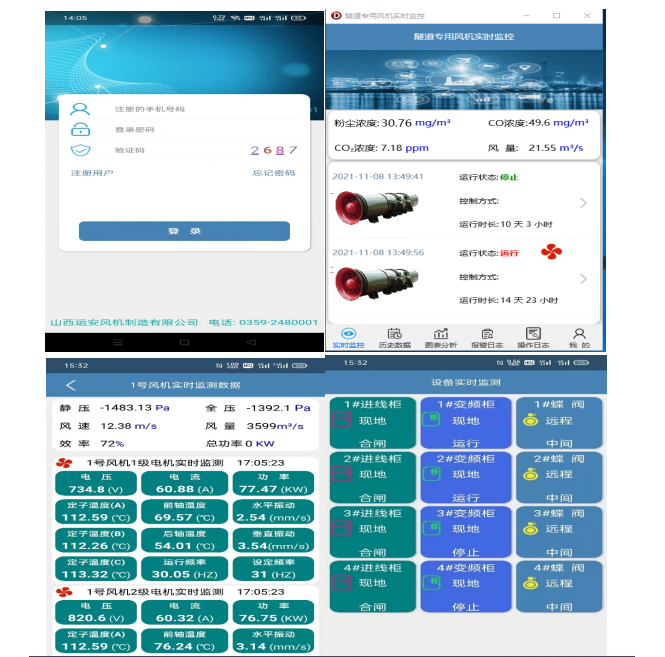 为实现随时随地的监测隧道环境以及风机的各个电机和设备的运行情况,专门针对(Android、HarmonyOS )手机用户开发移动版的APP程序。除了能实时监测风机各项运行参数信息、变频柜运行状况、历史数据查询以及风机、电机的运行历史记录和运行趋势图。还能实现一键开机、停机、复位和手动调节运行频率(注:需要具有管理员权限的操作员),普通操作员没有控制风机的权限,系统提供详细的操作日志,并能通过操作日志查询功能,查询到所有操作员的操作步骤。