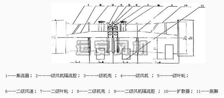 ⑴ 风机采用对旋式结构。即两台同型号风机对接连在一起,两极叶轮互 为反方向旋转,省去了主扇的中、后导叶的损失,从而提高了风机的效 率。