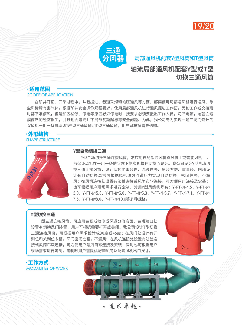 公司主要产品包括:矿用防爆轴流式FBCZ系列主通风机、FBCDZ系列对旋主通风机、FB系列压入式局部通风机、FBD系列压入式对旋局部通风机、FBD系列多级对旋通风机、FBC系列抽出式局部通风机、FBCD系列抽出式对旋局部通风机、SDF系列隧道风机和SDS系列射流风机等,型号规格。全系产品具有运行效率高、节能效果显著、噪音低、结构新颖、安装维修方便、对复杂巷道适应性强等独特优点,广泛适用于煤炭、隧道、冶金矿山等领域;
